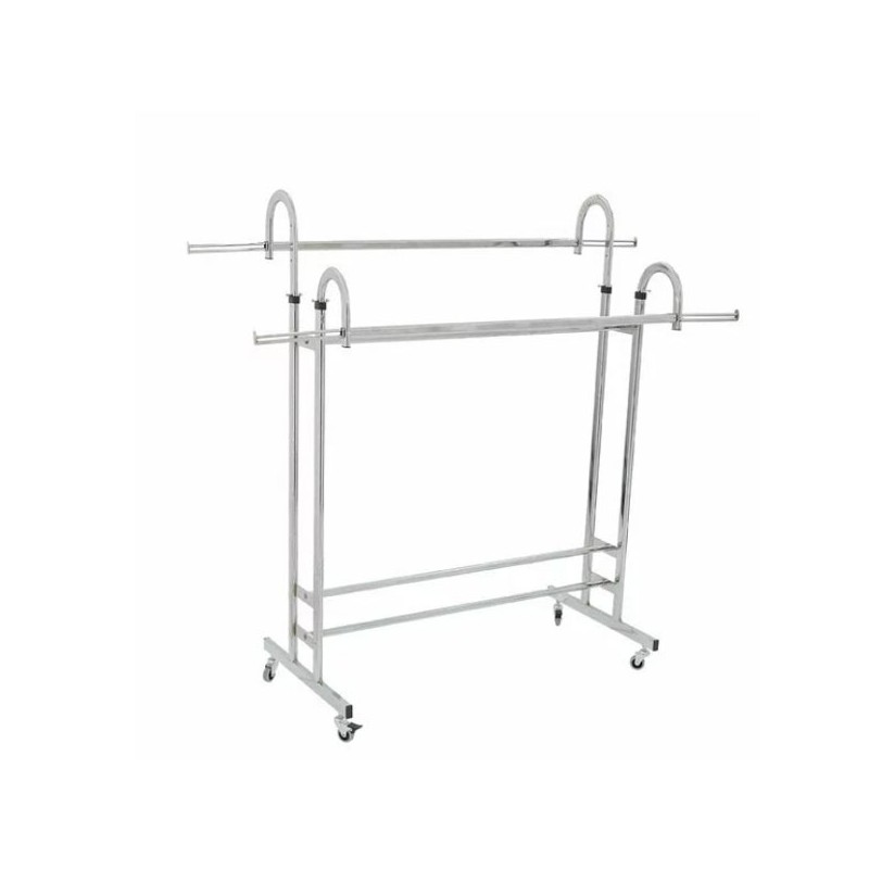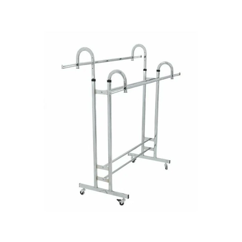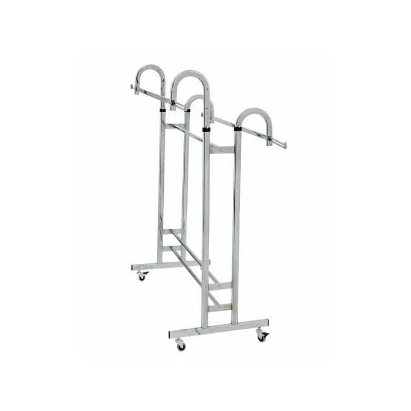Acest model de suport pentru haine are lungimea de 125 cm si ofera un spatiu de expunere generos, cu doua bare laterale cu inaltimea reglabila de la 160 la 180 cm permite untilizarea lui pentru o gama variata de aricole. Dotarea standard vine cu roti din metalice foarte rezistente care ajuta la mobilitatea stenderului.