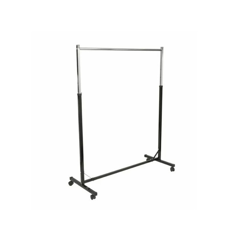 Acest model de suport pentru haine are lungimea de 125 cm si ofera un spatiu de expunere generos, avand inaltimea reglabila de la 140 la 160 cm permite untilizarea lui pentru o gama variata de aricole. Dotarea standard vine cu roti din plastic care ajuta la mobilitatea stenderului.