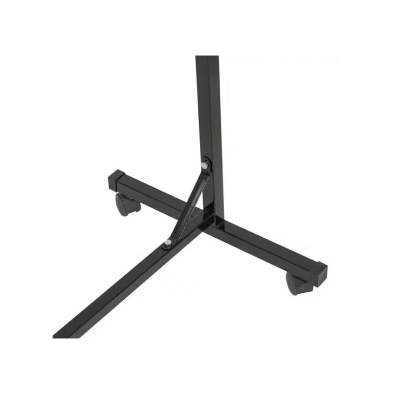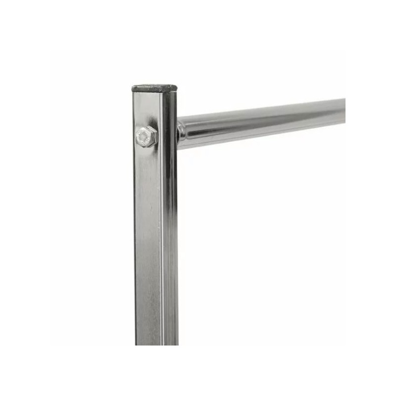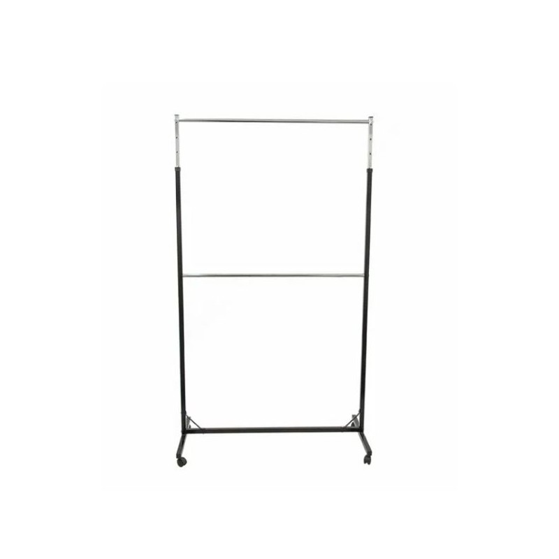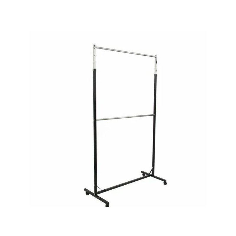 Acest model de suport pentru haine are lungimea de 125 cm si ofera un spatiu de expunere generos, cu doua bare orizonatale cea de sus avand inaltimea reglabila de la 180 la 220 cm permite utilizarea lui pentru o gama variata de aricole. Dotarea standard vine cu roti din plastic care ajuta la mobilitatea stenderului.